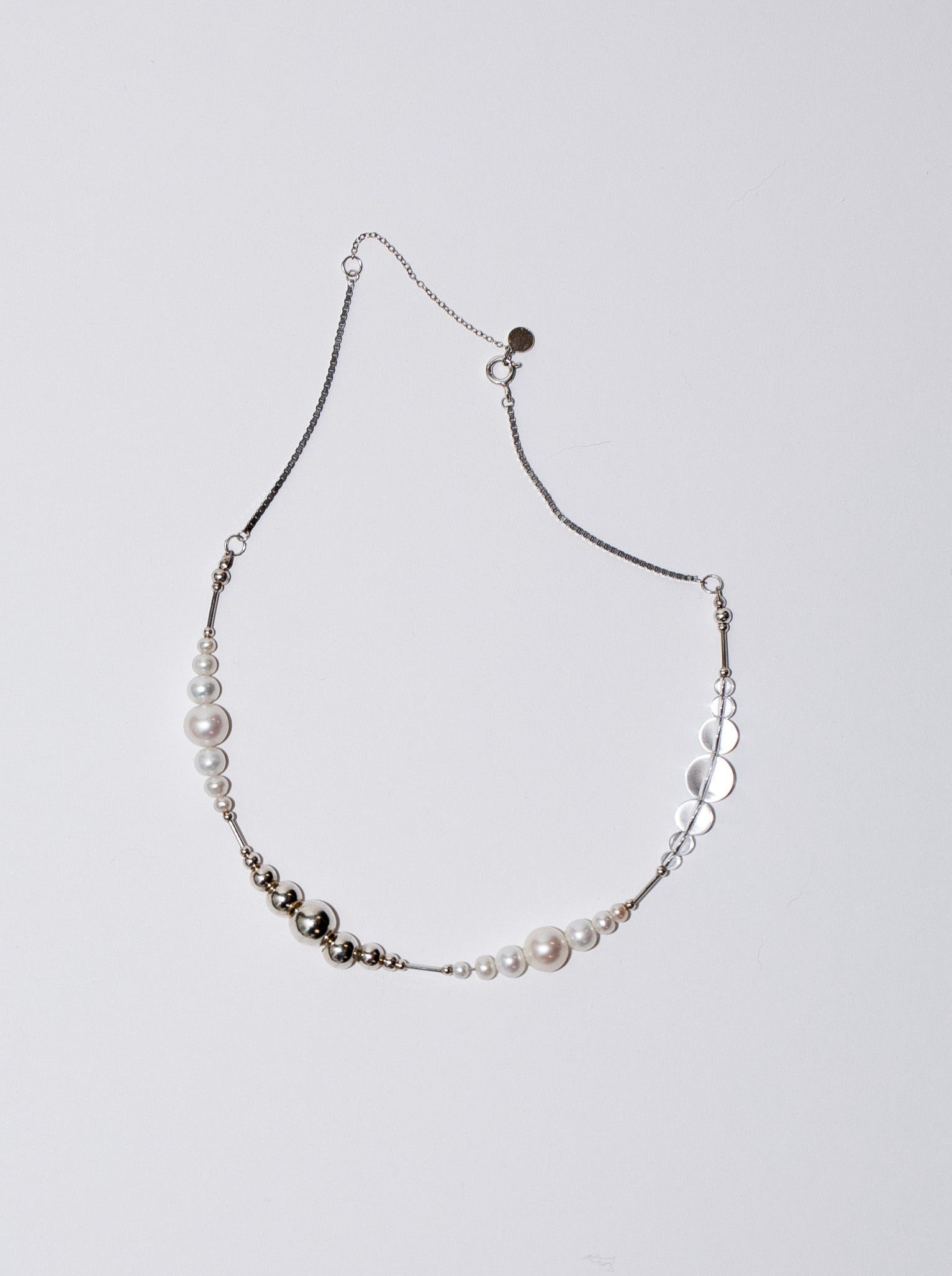 Crafted with 925 sterling silver, the necklace features a series of natural pearls and crystals, each adding its unique shape and sheen to the design. The necklace is punctuated with delicate silver details, giving the impression of water droplets on a spider's web glistening in the morning light.