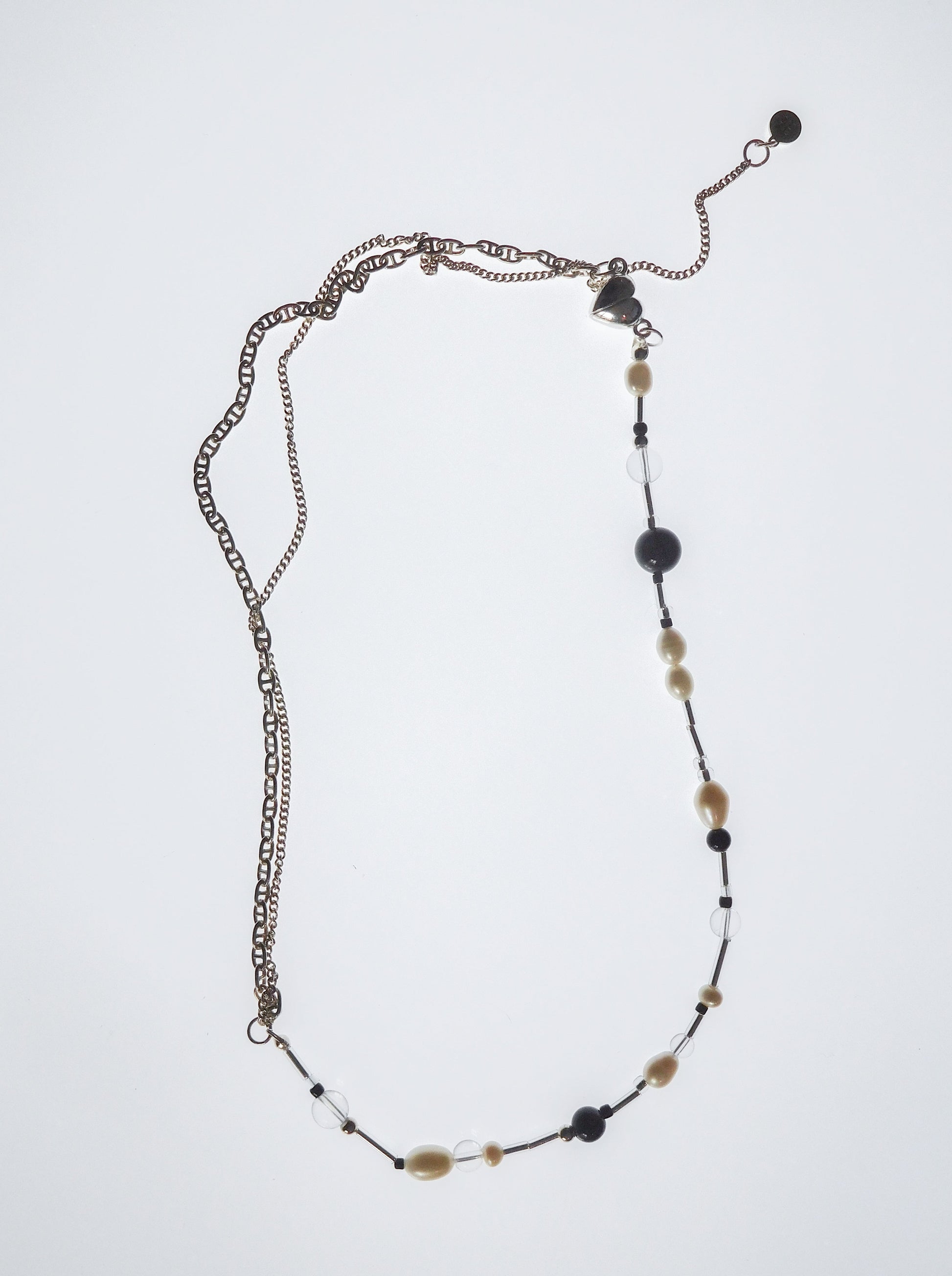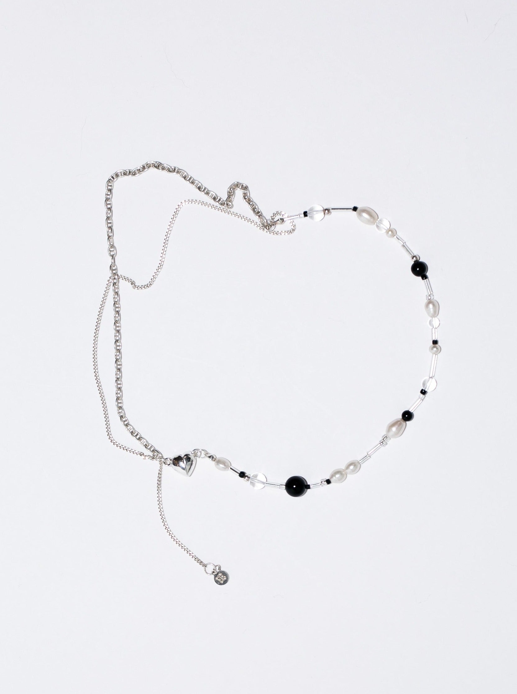 The "Lunar Contrast Necklace" is a tribute to the dualities of night — the gentle glow of the moon against the dark canvas of the sky. With alternating pearls and bold black accents, connected by delicate yet daring spiked chains, this necklace is a harmonious symphony of contrasts. It's designed for those who appreciate the blend of classic elegance with modern rebellion.
